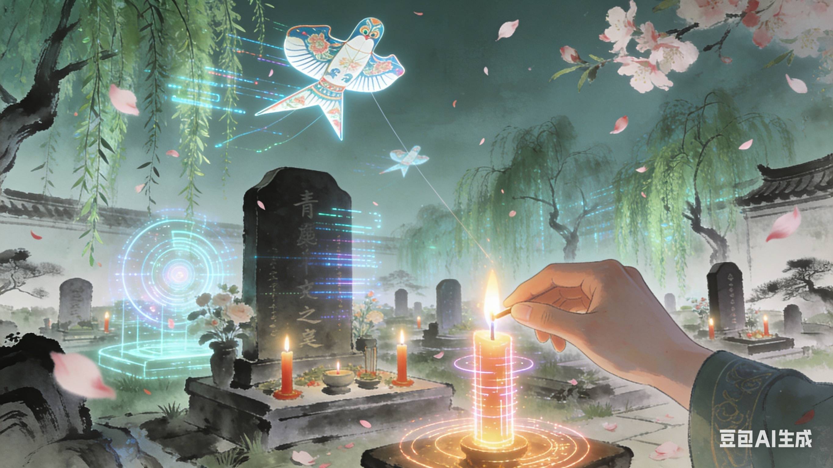 晴朗时,杨柳状的全息投影晃呀晃。数字纸鸢驮着念念念,往云霄墓园飞。香烛燃着粒子殊效,飘成细闪。花瓣雨落下,造成《寒食帖》的数据流。