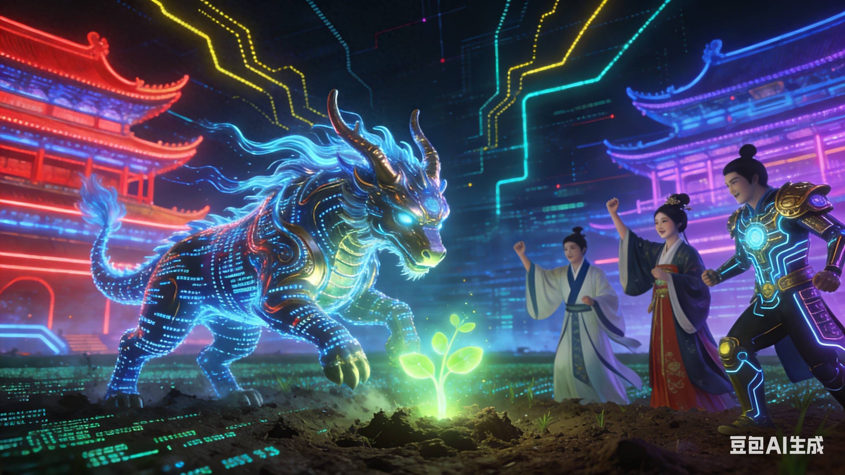 惊蛰到,代码雷兽撞破臆造冻土。数据流滚过,像雷声炸响。发光的数字种子,一下子醒了。穿赛博汉服的少年,伸手碰了碰刚冒头的嫩芽。霓虹描的古拓荒檐角,滴着二进制雨珠。